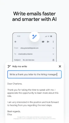 جی میل میں موجود جدید مصنوعی ذہانت کی طاقت کو جیمنی کی مدد سے محسوس کریں۔ آپ متعلقہ کی ورڈز کے ذریعے اپنے ان باکس میں تلاش کر سکتے ہیں یا جیمنی سے مخصوص تفصیلات تلاش کرنے کے لیے کہہ سکتے ہیں جو آپ کے ان باکس یا گوگل ڈرائیو فائلز میں موجود ہوں۔ جیمنی آپ کے ان باکس کے اندر سے ہی ایک ذہین تحریری معاون کے طور پر کام کرتا ہے، جس میں 'میری لکھنے میں مدد کریں' جیسی خصوصیات اور سیاق و سباق کے لحاظ سے سمارٹ ریپلائی شامل ہیں۔ ای میل سے ہی، جیمنی کے ساتھ فوری طور پر گوگل کیلنڈر میں دعوت نامے بنانے کے لیے 'کیلنڈر میں شامل کریں' بٹن کا استعمال کریں۔ اس کے علاوہ، Wear OS گھڑی پر جی میل کمپلیکیشن اور ٹائل کے ذریعے اپنی ای میلز کا فوری جائزہ حاصل کریں۔ جیمنی کی مکمل خصوصیات سے فائدہ اٹھانے کے لیے گوگل اے آئی پرو یا الٹرا پلان اور انٹرنیٹ کنکشن درکار ہو سکتا ہے۔ زبان اور ملک کی دستیابی مختلف ہو سکتی ہے، اور جوابات کی درستگی کی جانچ پڑتال ضروری ہے۔