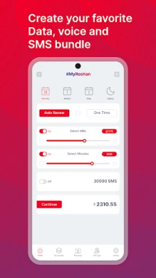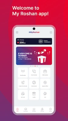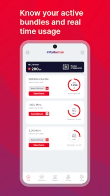 "My Roshan" ایپ آپ کے تمام موبائل سروسز کا ایک مکمل حل ہے۔ اپنے اکاؤنٹ کا انتظام کریں، ٹاپ اپ کریں، اور مختلف انٹرنیٹ، کال، اور رومنگ پلانز (بشمول الفا، گورنمنٹ، پوسٹ پیڈ) کو فعال کریں۔ استعمال کی جانچ کریں، خصوصی پیشکشیں حاصل کریں، اور گیمنگ سیکشن سے لطف اٹھائیں۔ یہ ایک آسان اور ہمہ گیر پورٹل ہے۔