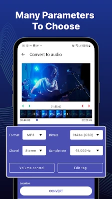 آپ کی سہولت کے لیے، یہ ایپلیکیشن مختلف قسم کے ویڈیو فارمیٹس کو سپورٹ کرتی ہے جن میں MP4, 3GP, WEBM, MKV, FLV, AVI, MOV, MPG, OGV, WMV, M4V شامل ہیں۔ تبدیلی کے بعد، آپ آڈیو کو MP3, AAC, AC3, WMA, FLAC, WAV, OGG یا OPUS جیسے متعدد آڈیو فارمیٹس میں محفوظ کر سکتے ہیں۔ "video to mp3 converter app" آپ کو آڈیو کے معیار پر مکمل کنٹرول فراہم کرتا ہے، جس میں 8000Hz سے 64000Hz تک کے سیمپل ریٹس اور 32kbs سے 256kbs تک کے بٹ ریٹس کا انتخاب شامل ہے۔ مزید برآں، آپ مونو/سٹیریو چینل منتخب کر سکتے ہیں، آواز کی سطح کو ایڈجسٹ کر سکتے ہیں اور فیڈ ان/فیڈ آؤٹ جیسے اثرات بھی شامل کر سکتے ہیں، جس سے آپ کو اپنے مطلوبہ آڈیو آؤٹ پٹ کی مکمل آزادی ملتی ہے۔