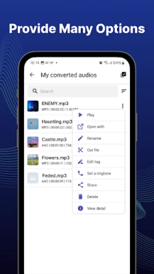 تبدیل شدہ آڈیو فائلوں کا انتظام "video to mp3 converter app" کے ساتھ کبھی آسان نہیں تھا۔ آپ آسانی سے اپنی تمام آڈیو فائلوں کو تلاش کر سکتے ہیں، انہیں نیا نام دے سکتے ہیں، تفصیلات دیکھ سکتے ہیں، دوستوں کے ساتھ شیئر کر سکتے ہیں یا غیر ضروری فائلوں کو حذف کر سکتے ہیں۔ ایک خاص خصوصیت ID3 ٹیگ ایڈیٹنگ ہے، جو آپ کو گانے کا عنوان، فنکار، البم، صنف، اور کور امیج جیسی معلومات کو تبدیل یا شامل کرنے کی اجازت دیتی ہے۔ اپنی پسندیدہ دھن کو آسانی سے رنگ ٹون کے طور پر سیٹ کریں یا اسے اپنے ڈیجیٹل کلیکشن میں شامل کریں۔ "video to mp3 converter app" یقینی طور پر آپ کی ڈیجیٹل آڈیو لائبریری کو منظم کرنے اور بہتر بنانے کا بہترین ذریعہ ہے۔ یہ ایپ بالکل مفت دستیاب ہے۔ musicstudio5.ltd کی ٹیم آپ کے تاثرات کو سراہتی ہے۔ اگر آپ کے پاس اس ایپ کے بارے میں کوئی سوالات یا تجاویز ہیں تو براہ کرم